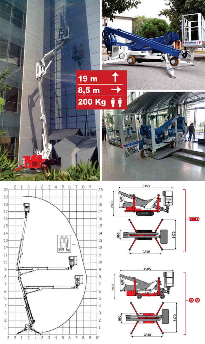 TZX190蜘蛛式曲臂高空作業(yè)車是高空作業(yè)平臺中重量較輕的伸縮臂升降平臺,其特點是自重較輕,可運用在大廈、商場、酒店等不能承受過重升降設(shè)備的場所。運用四條支腿為支撐點,支撐整個設(shè)備在升降中的平衡,體形小巧,可通過正常門框,動力為交流電、電瓶或燃油。TZX170蜘蛛車底盤可以配置履帶式和輪胎式兩種行走形式的底盤。